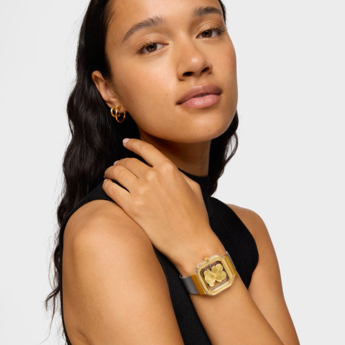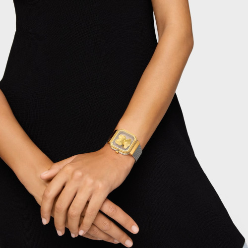 Reloj analógico TOUS D-Bear Party con brazalete de acero inoxidable, acero dorado y caja transparente de policarbonato. Dimensiones: 36 mm x 48 mm. Esfera de metal con oso facetado acrílico asemejando una gema. Cristal mineral plano octogonal. Funciones: hora y minutos. Impermeable a 3 ATM, sólo salpicaduras. Movimiento analógico de cuarzo japonés. Brazalete: 23mm x 18mm x 74mm / 23mm x 18mm x 105mm. Cierre malla milanesa con cierre de seguridad.