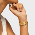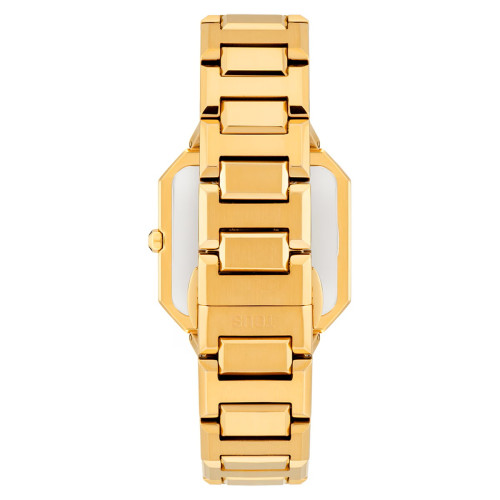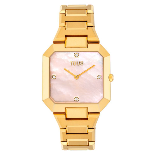 Reloj Tous Karat Square. Movimiento de cuarzo de 2 agujas. Caja octogonal de 32x32mm y brazalete de eslabones con cierre deployante oculto de dos pulsadores, todo fabricado en acero 316L hipoalérgico acabado IP dorado. Cristal mineral. WR 3bar, sólo salpicaduras. Elegante esfera de nácar rosado decorada con circonitas.