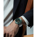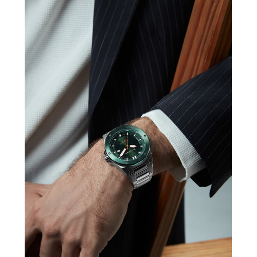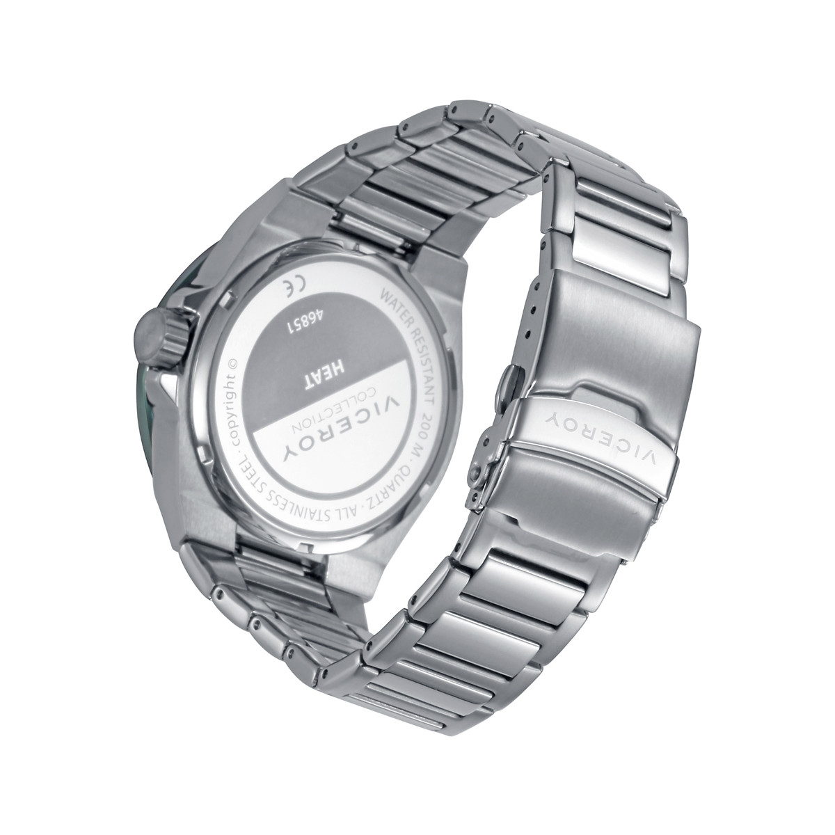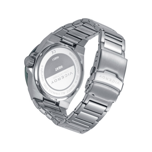 Espectacular reloj Viceroy Heat para hombre. Movimiento de cuarzo de tres agujas y calendario. Caja de 44mm de diámetro y brazalete de eslabones con cierre desplegable de dos pulsadores y cerrojo de seguridad, todo fabricado en acero 316L hipoalérgico. Bisel liso cepillado decorado con tornillos acabado en IP verde a juego con la esfera. Detalles en la esfera de color naranja. Cristal mineral. WR 20bar.